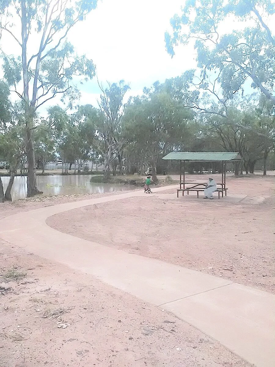 To an indigenous Australian [either ‘black’ or ‘white’, someone born here who has travelled regional Australia and knows it] the location is familiar and pregnant with artistic possibilities to speak to the human condition - the feeling of the inevitability of ‘Bogan’ architecture as it spreads across Australia, ever so practical but ugly, with its corrugated iron and steel pavilion and bench and the backyard fences encroaching onto the murky stand of water; and the surrounding grounds denuded by overuse, all coupled with a sadness at the loss of what would have once been, in Aboriginal times, the pristine beauty of the Tara Lagoon, a wetland teeming with wildlife.