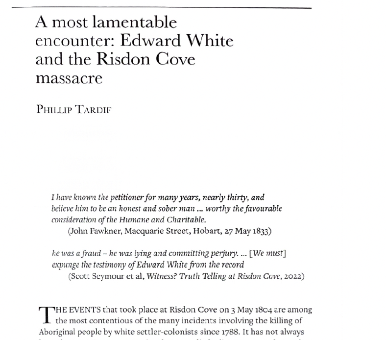One of the most consequential questions raised by the reviewer went to the heart of the book thesis - were the historians who took Edward White’s testimony as fact relying on a historigraphy that was flawed in placing White at Risdon Cove in 1804?