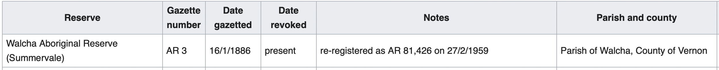 Figure 13 - Excerpt from the List of Aboriginal Reserves of NSW. Walcha is located about two hundred kilometers south west from the Clarence River region, where Mary Cowper was actually raised. Source: Wikipedia