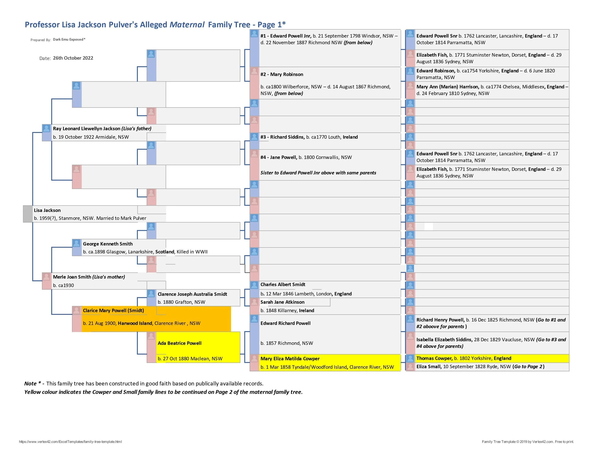 Figure 1 - Professor Lisa Jackson’s maternal grandmother, Clarice Mary Powell (highlighted in orange) is claimed by the Professor to be Aboriginal. Clarice’s father [Clarence J.A. Smidt] is not Aboriginal, but instead is of English and Irish descent. Clarice’s grandfather [Edward Richard Powell] is not Aboriginal - all his family are of English or Irish descent. Clarice’s mother [Ada Beatrice Powell] and her grandmother [Mary Eliza Matilda Cowper] are not Aboriginal via the Cowper family patriarch, Thomas Cowper, who was born in England (all highlighted in yellow). Sources: public records. File download here