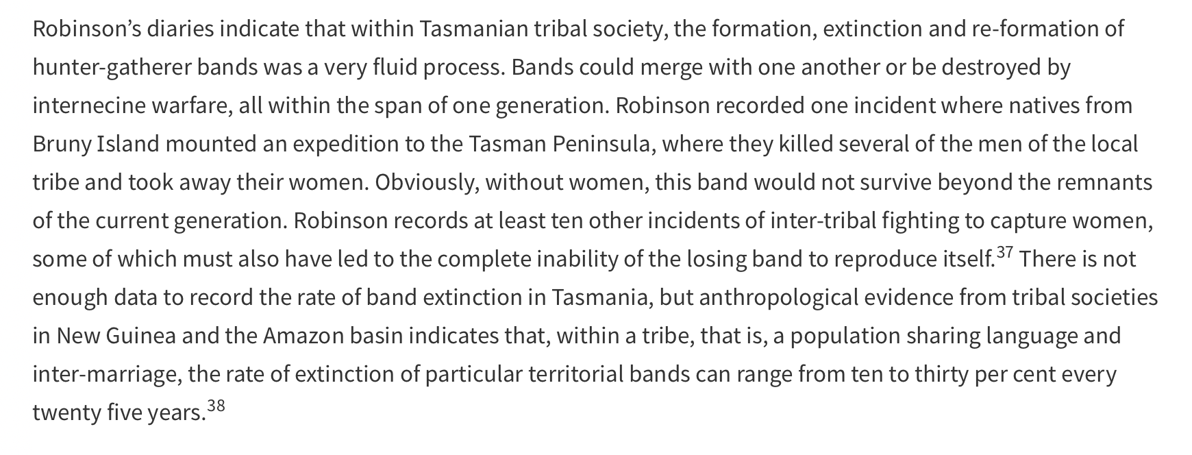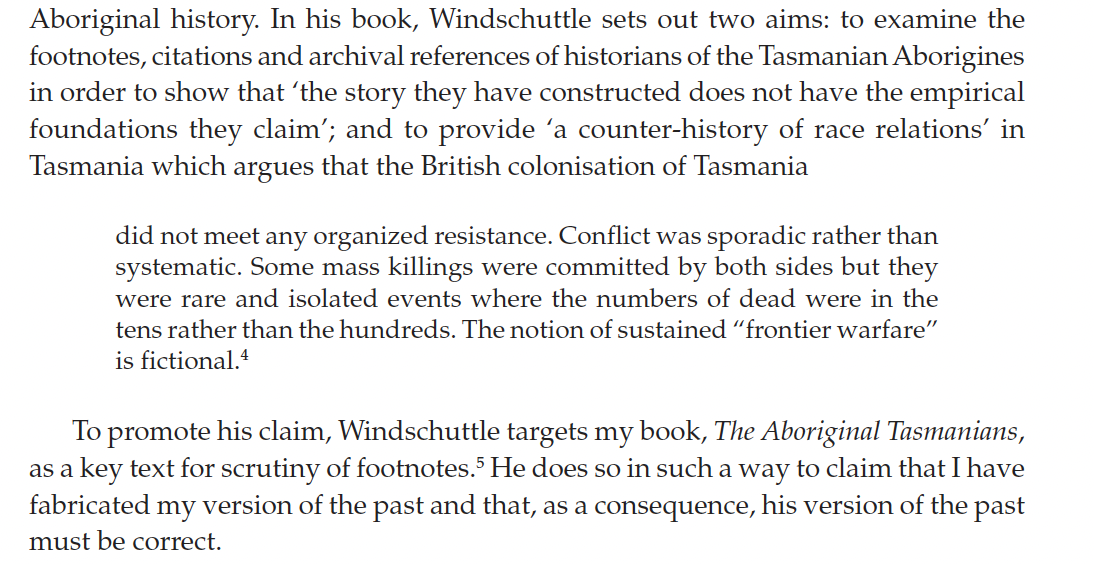 "The first part of [my] essay will demonstrate just how flimsy is the case that the massacre of Aborigines was a defining feature of the European settlement of Australia. The second part will examine the estimates by historians [such as Henry Reynolds and Lyndall Ryan] of the total number of Aborigines killed and show that some of the key assumptions upon which these calculations have been made are either unfounded or invented. The third part will discuss the motives behind the long tradition in Australia — a tradition begun by missionaries in the early nineteenth century and perpetuated by academics in the late twentieth — of the invention of massacre stories.
