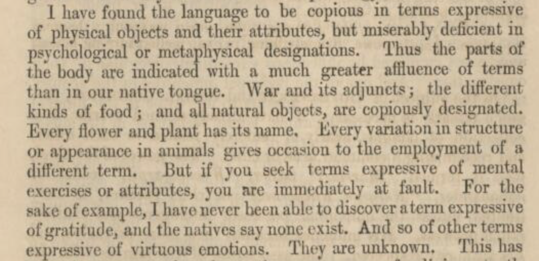 ‘Of the natives of this country [that is, the Australian Aborigines] he had the most contemptible opinion, which…he…did not fail to manifest by discovering the utmost abhorrence at their going naked, and their want of ingenuity or inclination to procure food and make themselves comfortable, on which subject Te Pahi on every occasion reproached them severely’.