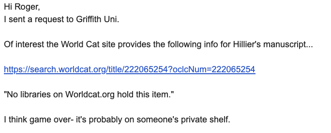 But there is a problem - we have searched high and low for a copy of Hillier’s manuscript and cannot find one. Thus, we are concerned that we cannot easily. corroborate Evan’s claims in his essay when he cites Hillier’s ‘research’, as in Figure 1: