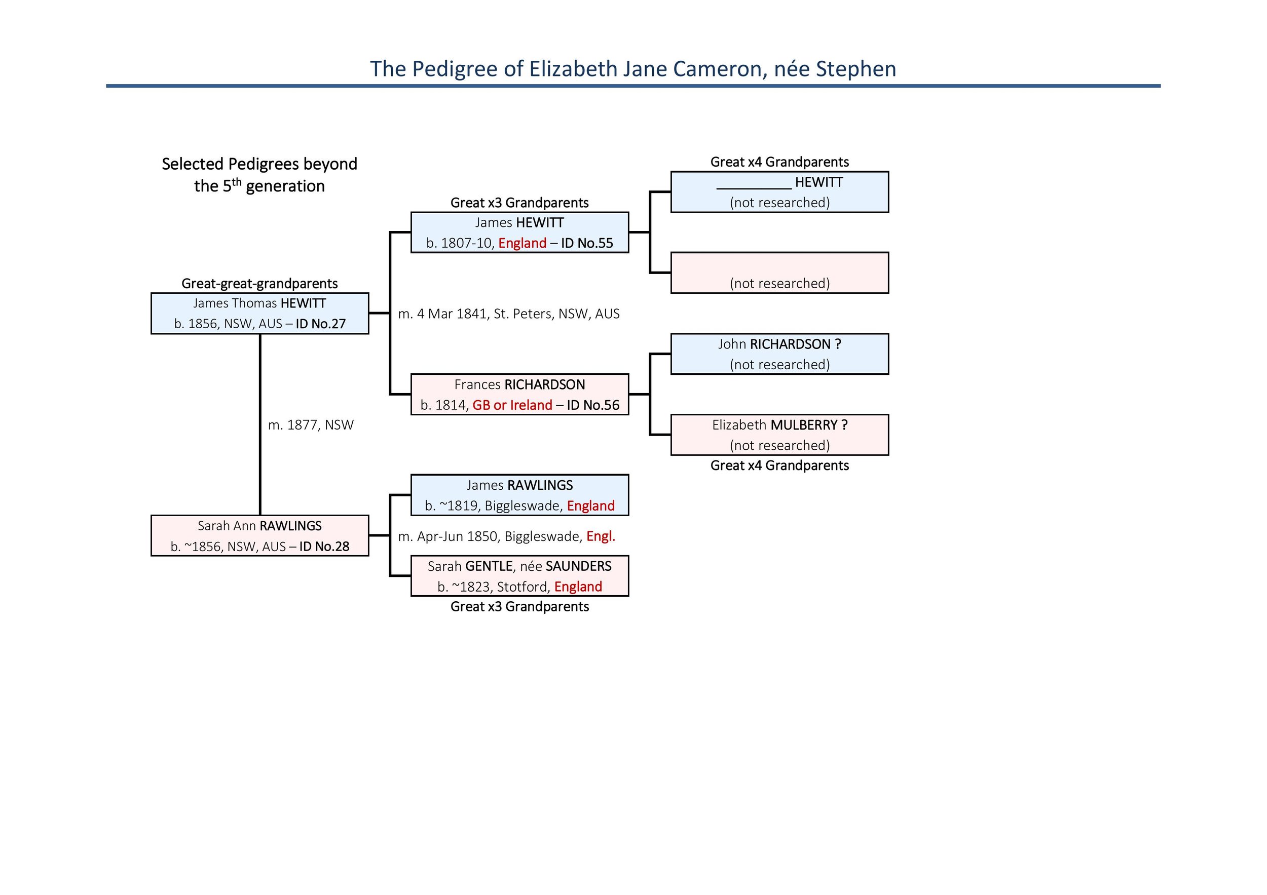 Figure 4 - Continuation of Apparent Family Tree of Liz Cameron nee Stephen (Part 2 - 5th generation Hewitt & Rawlings) (subject to Disclaimer).Source: Download file here
