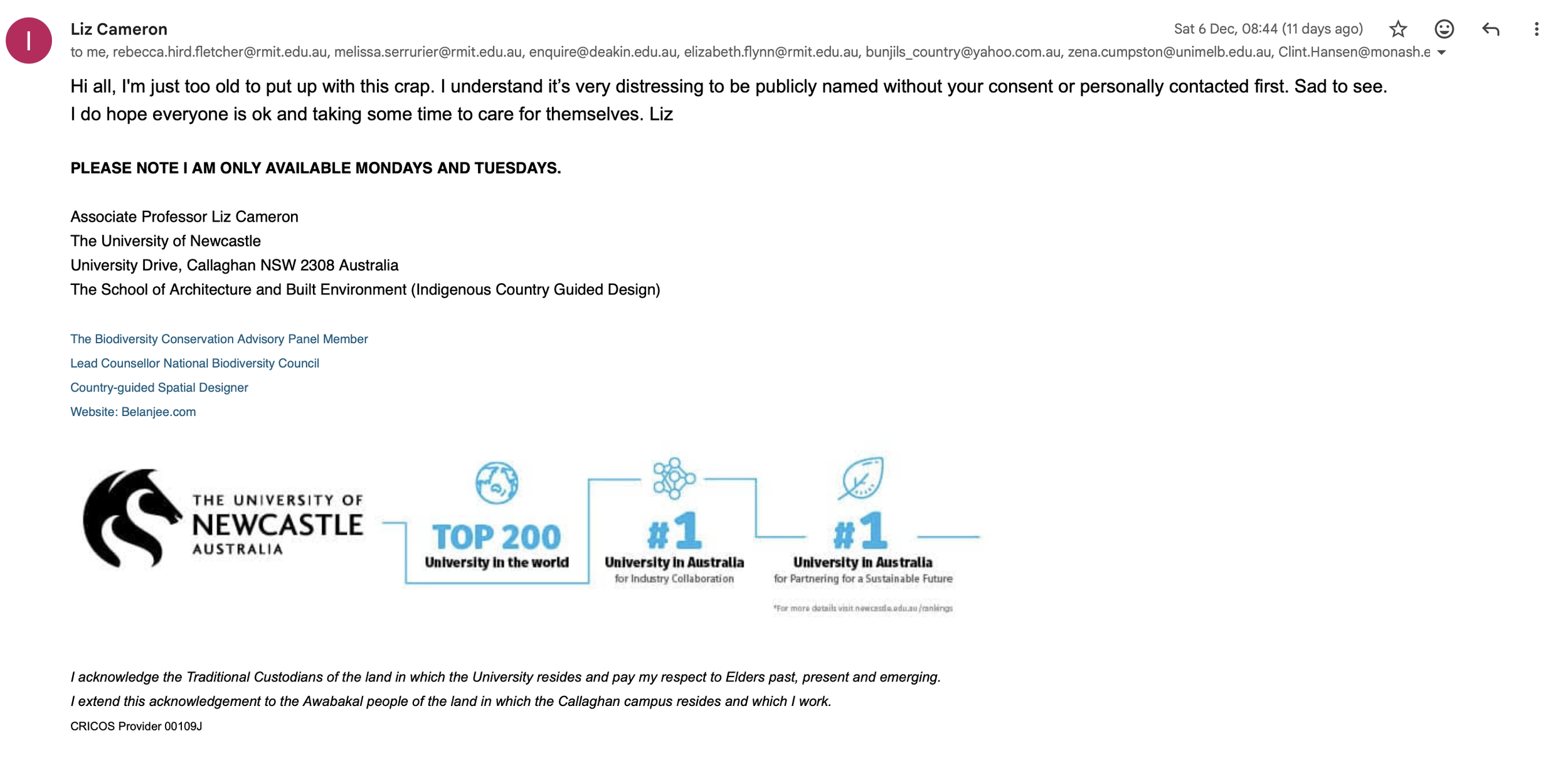 Four of the twelve responded, including Assoc. Professor Liz Cameron. Her response, cc’d to all the other eleven Aboriginal academics, is illuminating (Figure 8):