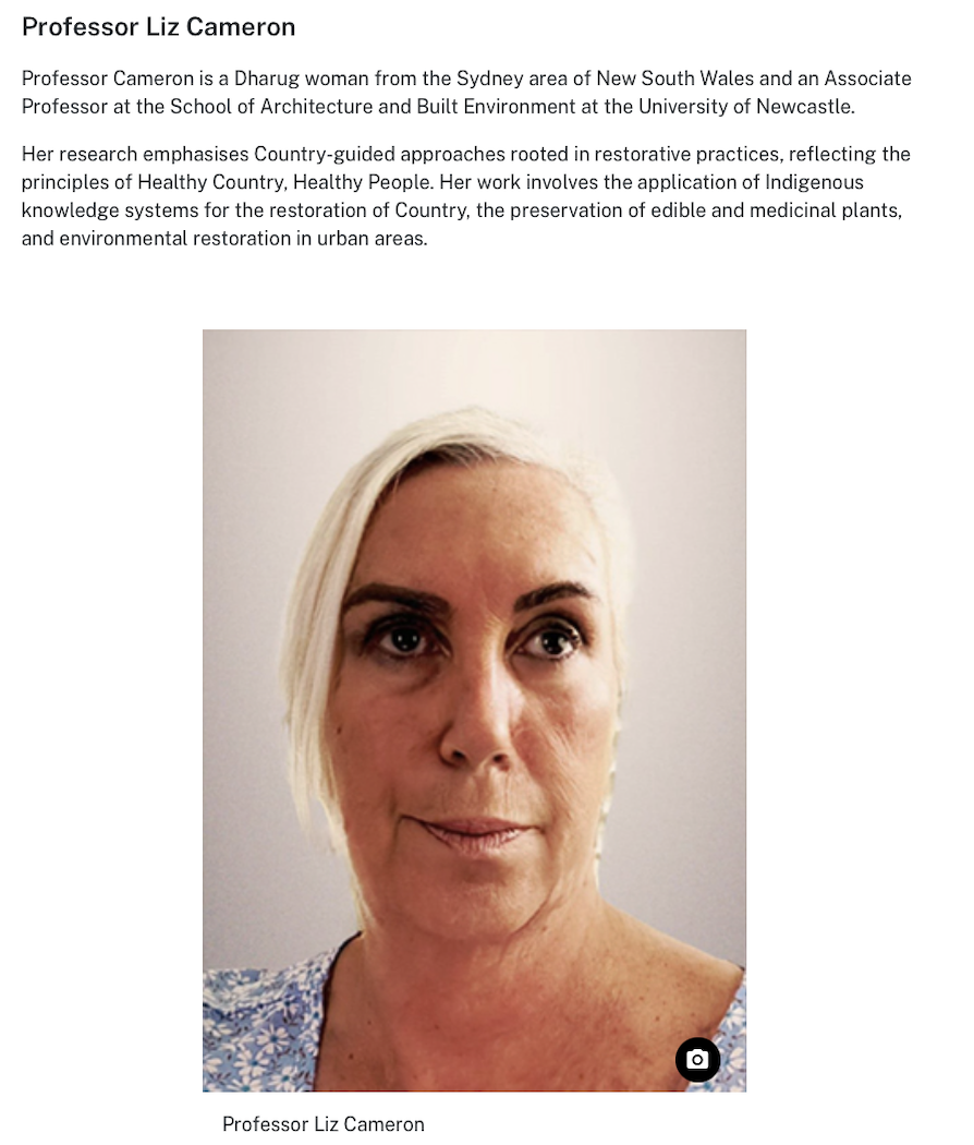 played a pivotal role as one of four Indigenous academics shaping architectural education and practice in New South Wales. With a background in occupational therapy, spatial design, and art, Liz brings a unique, cross-disciplinary perspective to her work, enriched by her commitment to cultural integrity and authentic engagement with Country. (Source)