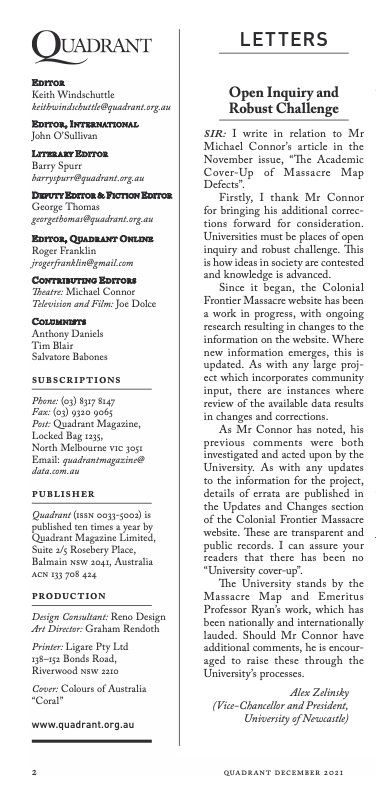 Figure 8 - VC Zelinsky’s Letter to Editor in Dec 2021 Quadrant Magazine