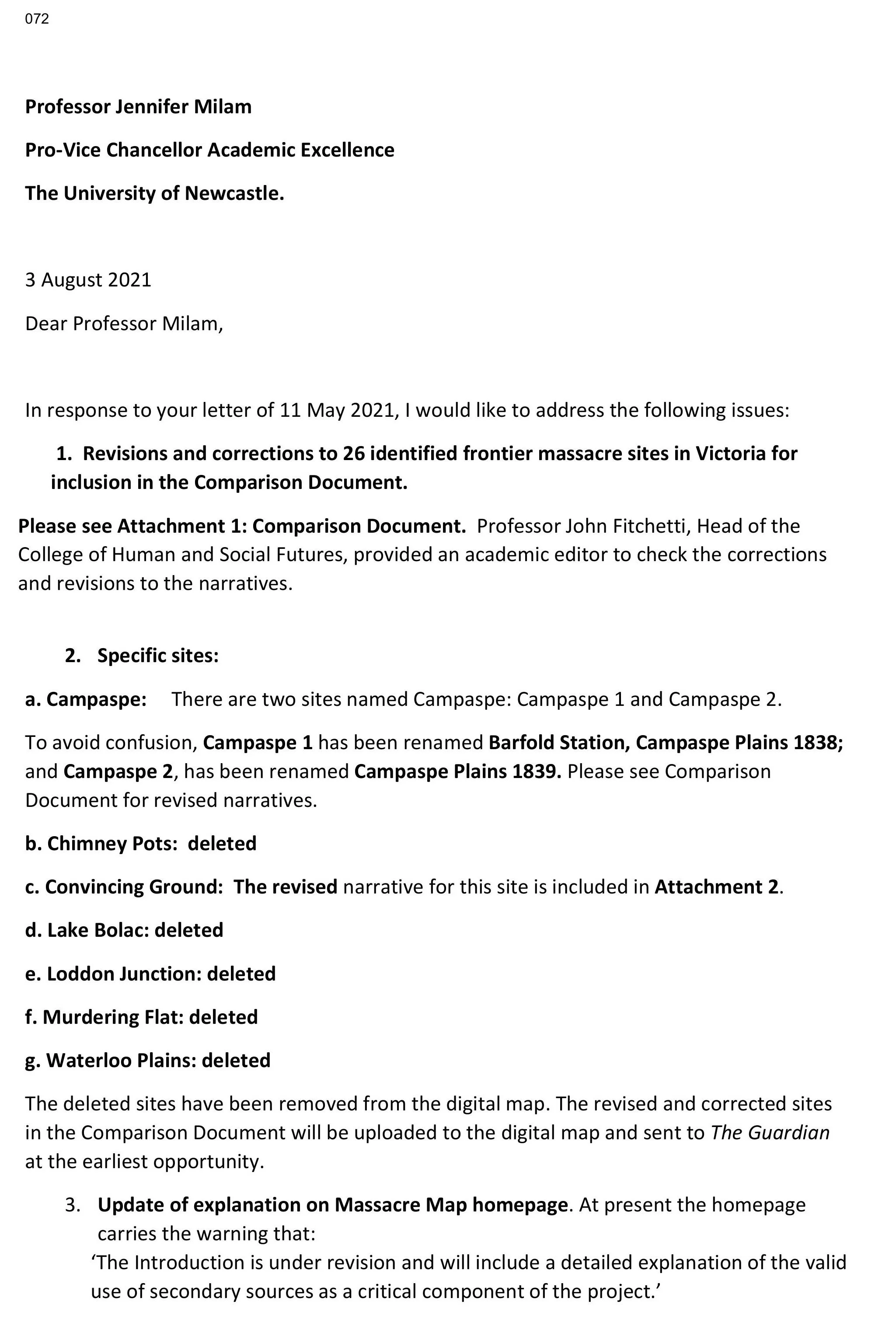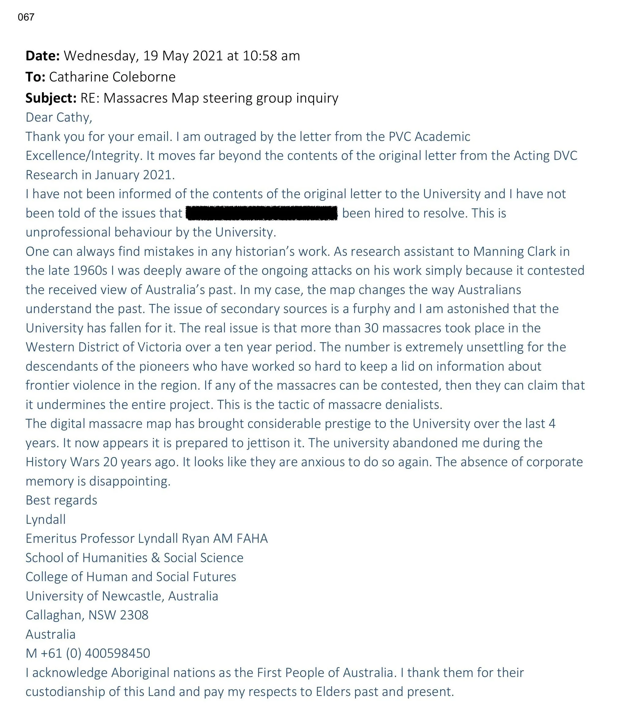 As detailed in the following set of emails, the Colonial Massacre Map’s creator and administrator, the late Emeritus Professor Lyndall Ryan, essentially had to be dragged kicking and screaming by an outside auditing academic expert to address Connor’s list of complaints. Under the GIPA [FOI] request, 55 pages of the auditor’s report and related correspondence were released (out of a total of some 700 pages related to this audit process).