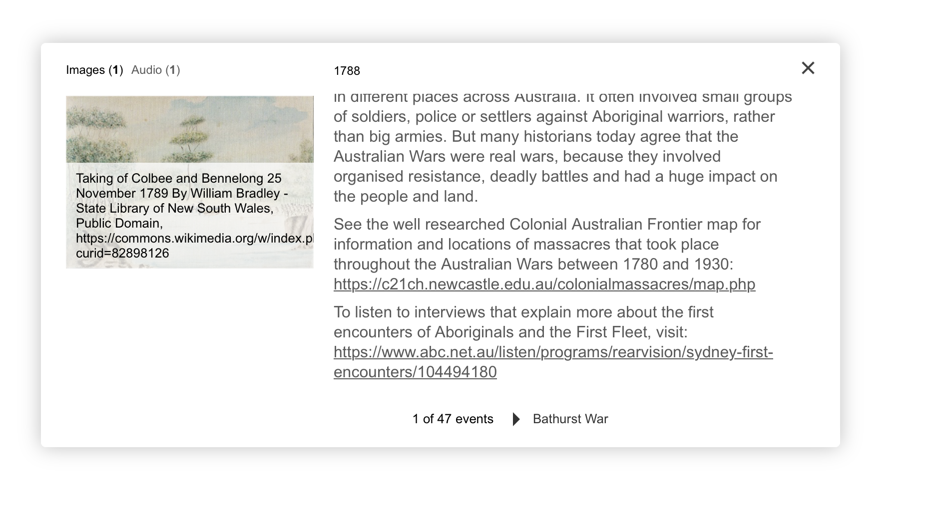 Figure 1 - Screenshot of the “chronoflotimeline teaching resource”, for Year 9 and 10 students, titled Australia’s War History - Colonisation and Australian Wars, which was published by the Academy of Social Sciences in Australia. The Academy has relied upon the University of Newcastle’s “well researched Colonial Australian Frontier [Massacre Map]” for its information concerning the so-called “Frontier Wars.” Source